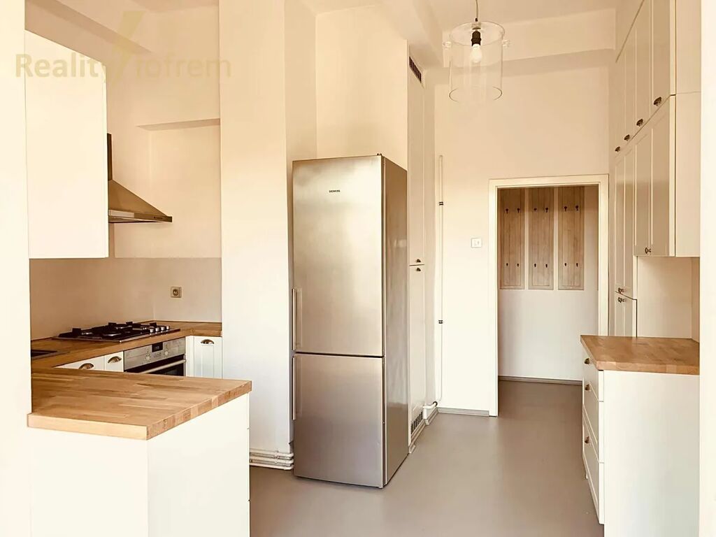 Kuchyně s balkonem a výhledem do zeleně je vybavena vestavěnými spotřebiči (myčkou nádobí, elektrickou troubou, digestoří), lednici s mrazákem a dalším úložným prostorem (vestavěnými skříněmi).