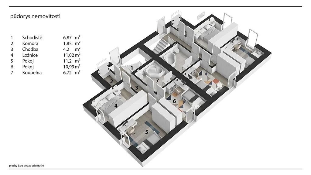 V horním patře najdete zde tři samostatné, neprůchozí pokoje, které mohou sloužit jako ložnice, dětské pokoje, pracovna nebo třeba hobby místnost. Součástí patra je také komora pro uskladnění sezónních věcí a druhá koupelna vybavená vanou a toaletou, která vám dopřeje zasloužený relax po náročném dni.