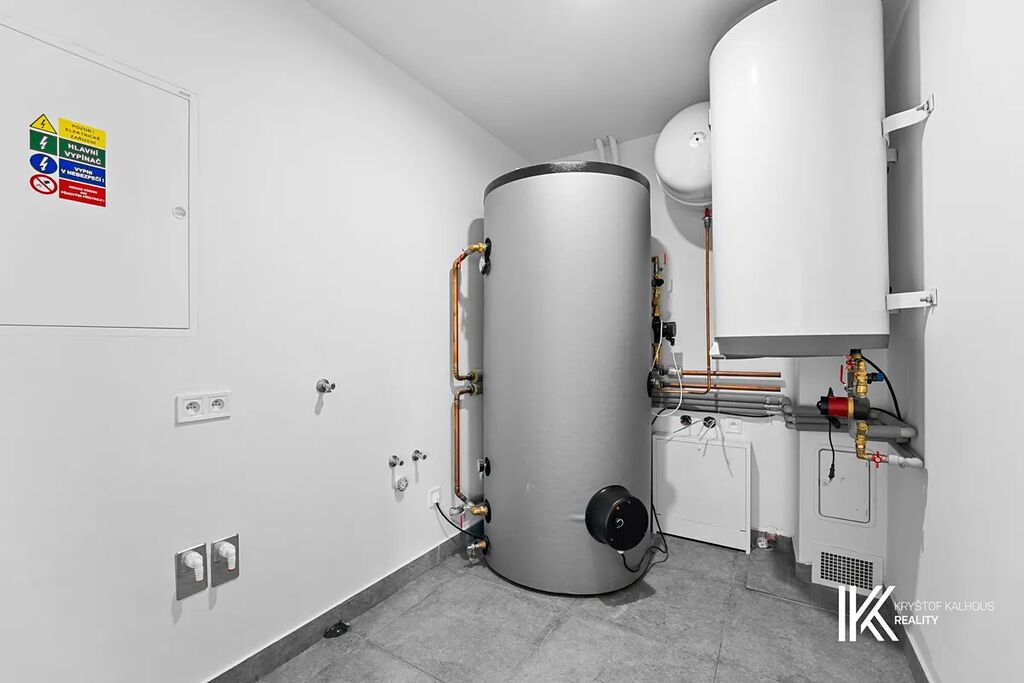 Na stejném podlaží se nachází koupelna se sprchovým koutem a toaletou, která je prakticky umístěna nedaleko vstupu a skvěle poslouží i návštěvám. Technická místnost pak umožní uložit pračku, sušičku a další domácí potřeby, takže v obytné části domu zůstane dostatek místa a čistý, vzdušný dojem.