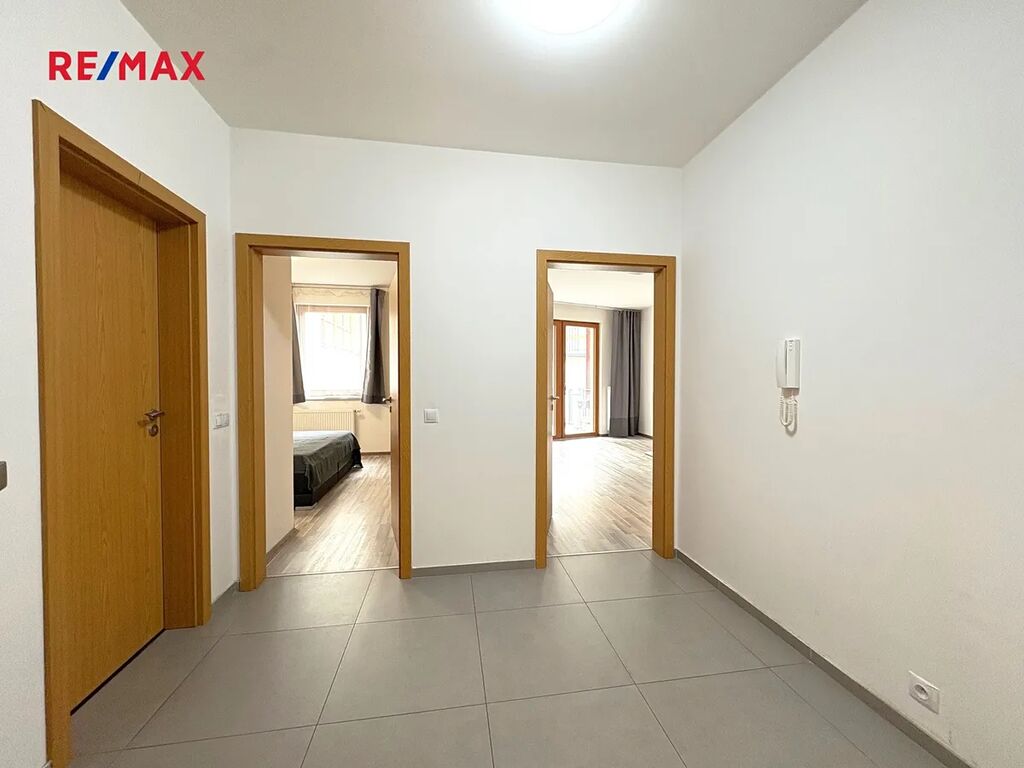 Interiér bytu je tvořen vstupní předsíní, velkým obývacím pokojem se vstupem na terasu a s kuchyňským koutem s moderní kuchyňskou linkou s vestavěnými spotřebiči (sklokeramická varná deska, digestoř, elektrická trouba, mikrovlnná trouba, myčka nádobí, lednice s mrazákem), dále 2. pokojem s vestavěnou skříní, koupelnu se zděným sprchovým koutem a samostatnou toaletou.