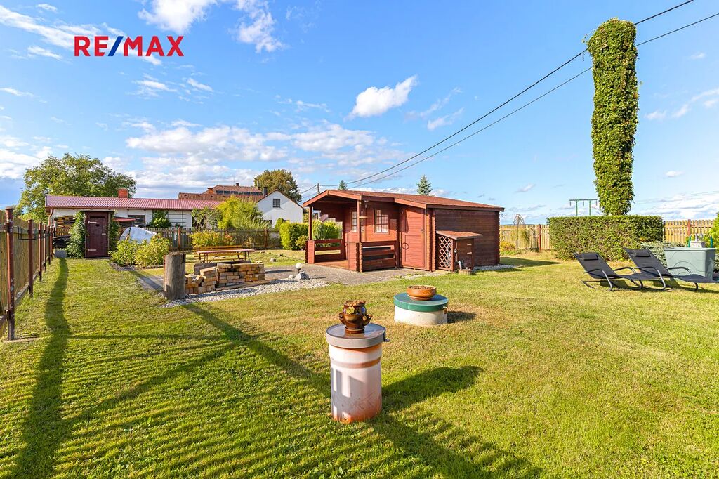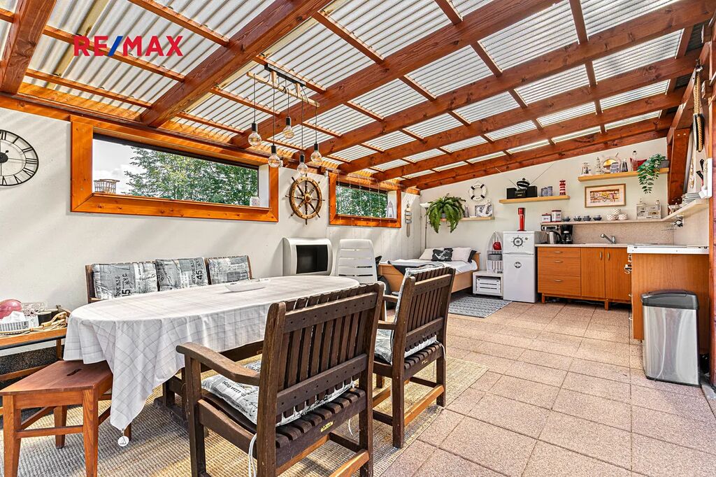 Díky elektrickým roletám lze pergolu snadno uzavřít a využívat ji i za horšího počasí. Na zahradě je bazén o ploše 20 m2, který v létě potěší děti i dospělé. Okrasné záhony, skalka, vzrostlé keře a stromy dotvářejí příjemnou atmosféru. Vše efektivně doplňuje zahradní domek o velikosti cca 14 m2, který může sloužit jako místo pro hosty nebo sklad zahradního náčiní.