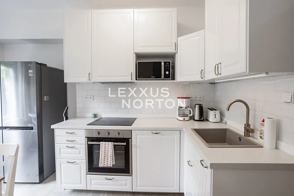 Kuchyně je vybavena sklokeramickou varnou deskou, troubou, americkou lednicí s mrazákem a myčkou nádobí, takže nabízí vše potřebné pro pohodlné vaření. V koupelně se nachází sprchový kout a kombinovaná pračka se sušičkou. Ložnice disponuje manželskou postelí, patrovou postelí a volně stojícím věšákem na oblečení. Vstupní chodba je zařízena prostornou skříní s dostatkem úložného prostoru.