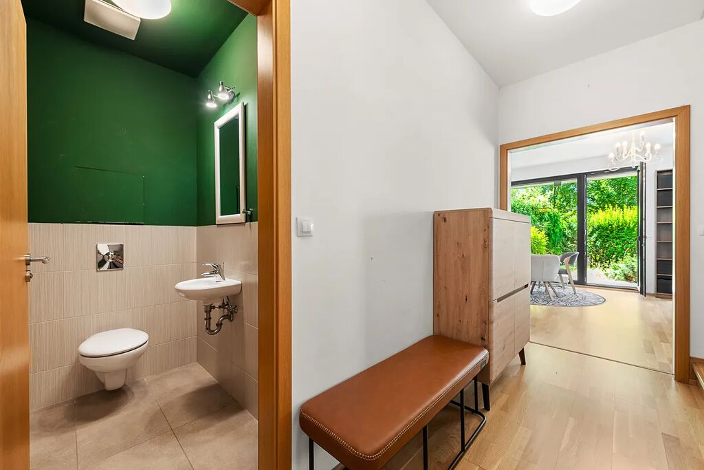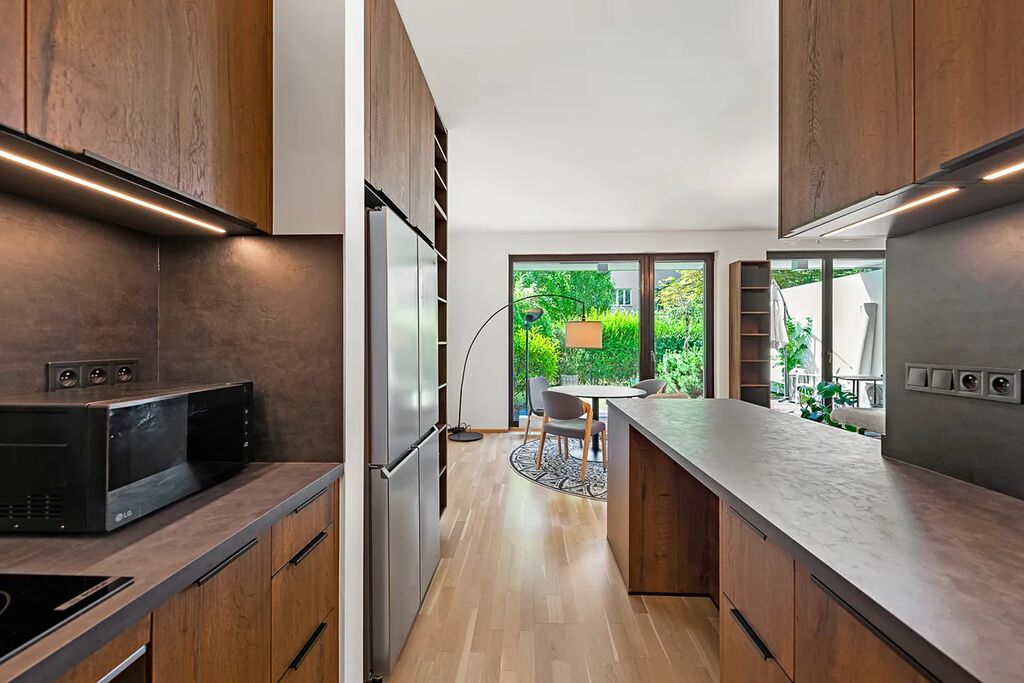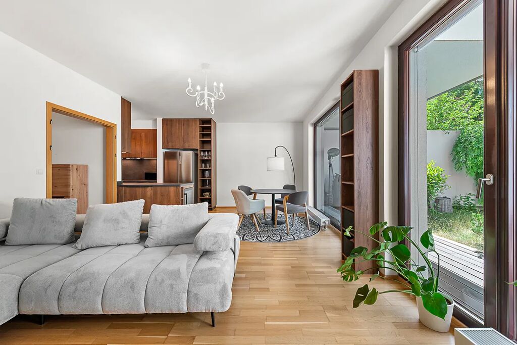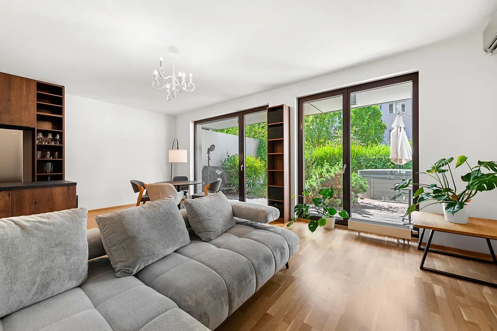 V přízemí bytu se nachází prostorný obývací pokoj s úplně novým kuchyňským koutem vybaveným kvalitními spotřebiči. Z obývací části je přímý vstup na předzahrádku s klidným posezením, kde najdete gril a vířivku – ideální místo pro relaxaci. V přízemí je také nová klimatizace, která zajišťuje příjemné prostředí i v horkých dnech.
