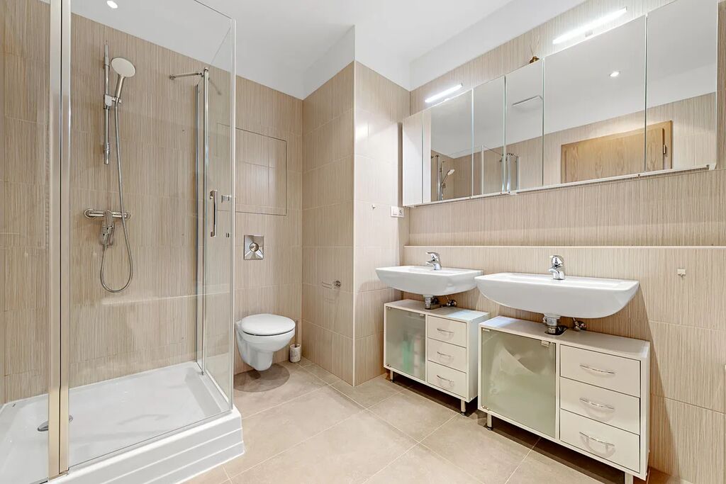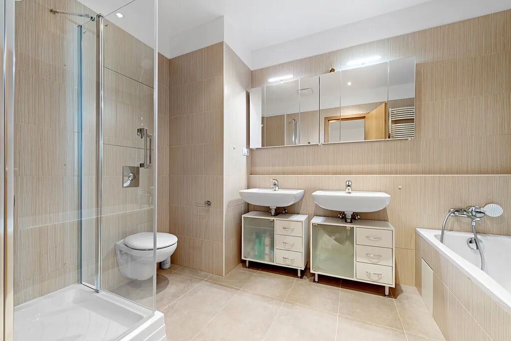V prvním patře bytu jsou dvě ložnice. Jedna má vlastní šatnu, druhá může sloužit jako dětský pokoj nebo pracovna. Obě ložnice mají vstup na balkon. V patře je také velká společná koupelna vybavená vanou, sprchovým koutem a toaletou. Nechybí ani další vestavěné skříně a úložné prostory.