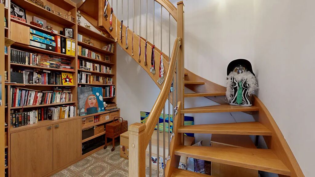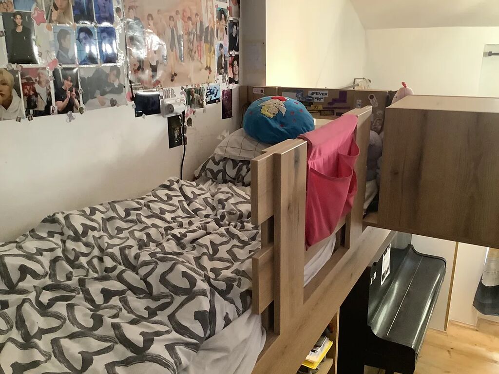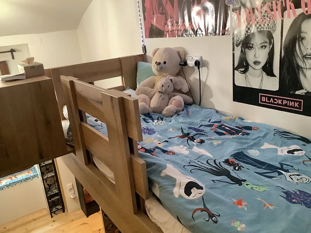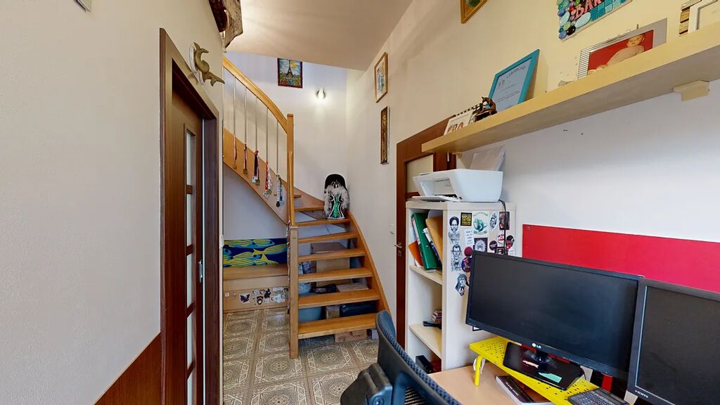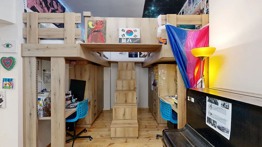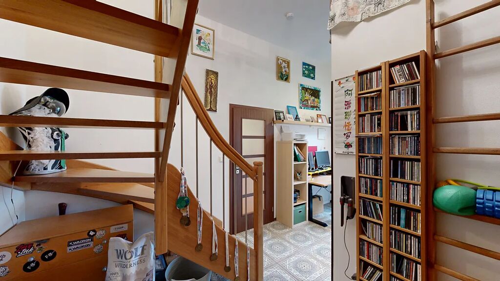 V levé části bytu se nachází průchozí pokoj (13,6 m²) s vlastní koupelnou a toaletou (4,2 m²) a schodištěm do 2. NP, kde je ložnice (11,3 m²) s balkonem (4,3 m²).