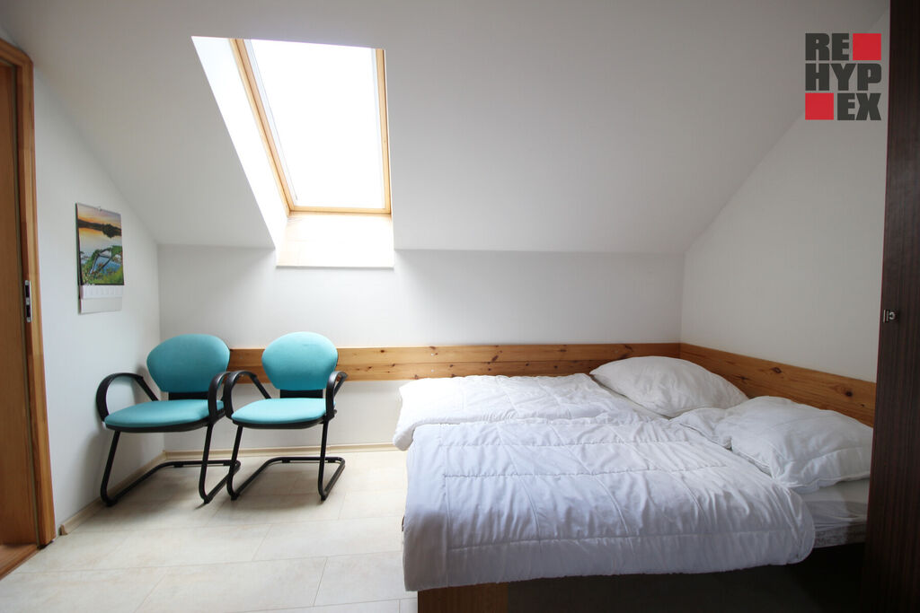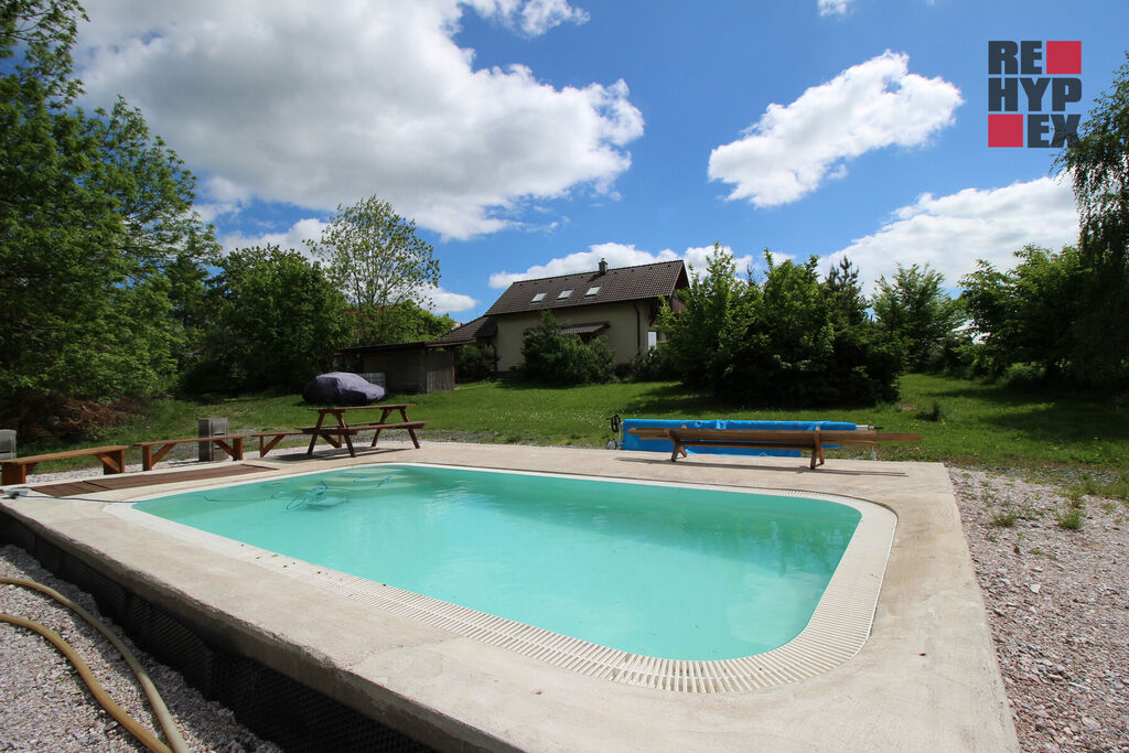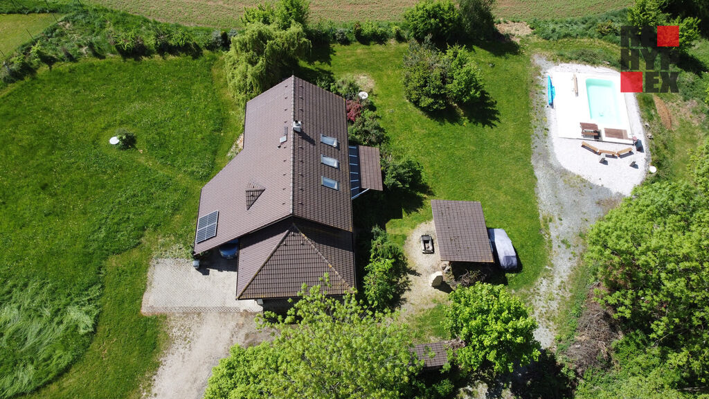 Na profesionálně udržované zahradě se nachází pergola, zahradní domek s ohništěm, bazén 6 x 3 m, terasa s posezením u jezírka, garáž, přístřešek pro auta a dostatek prostoru pro parkování.
