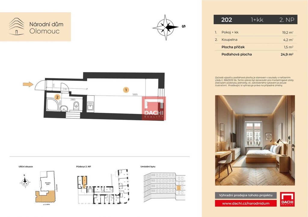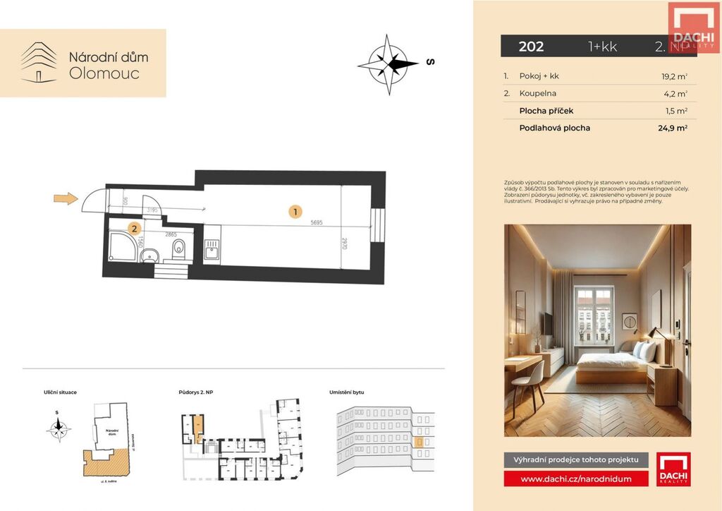 V rámci projektu nabízíme byt č. 202 o dispozici 1+kk s podlahovou plochou 24,9m, který se nachází ve 2. nadzemním podlaží.
