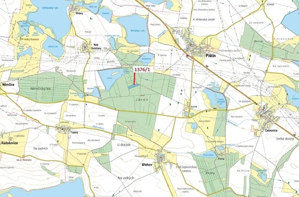 Lesní pozemek o výměře 13 807 m2, parcelní číslo 1376/1, podíl 1/1, katastrální území Břehov, obec Břehov, obec s rozšířenou působností České Budějovice, okres České Budějovice, Jihočeský kraj. Částečně po těžbě.