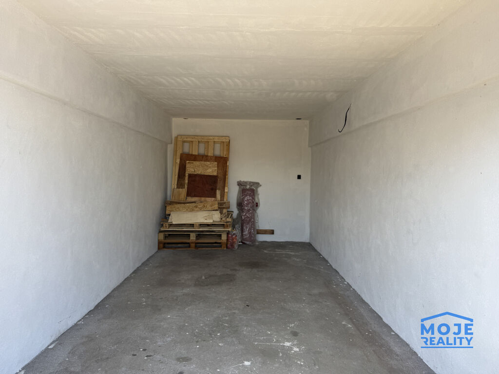 Garáž je suchá, čistá a nově vymalovaná, se zrenovovanou omítkou na stropě.