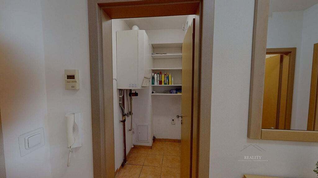 samostatné WC, technická místnost s pračkou, plynovým kotlem a úložným regálem,