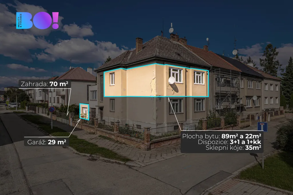 Dvě bytové jednotky v ceně! 3+1 (89 m²) a 1+kk (22 m²), k tomu zahrada 70 m², garáž 29 m², 3 sklepy 35 m², navíc ve vyhledávané a klidné lokalitě Prostějova.