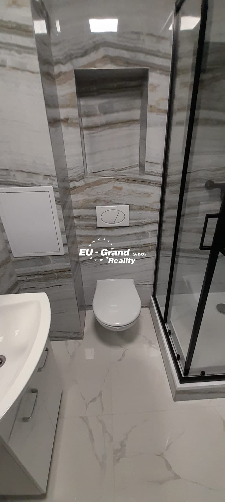 Koupelna je společná s WC. Je vybavená umyvadlem, sprchovým koutem a dostatečným prostorem pro umístění pračky.