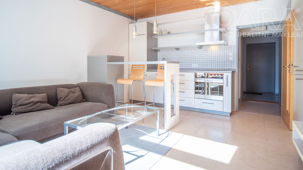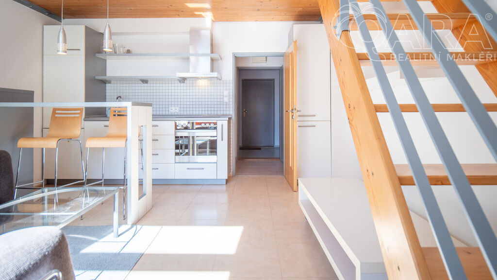 Jedná se o dvojúrovňový obytný prostor. Na nižší úrovni je situován obývací pokoj, kuchyňský kout, sociální zázemí (koupelna + WC) a zádveří. Zvýšené podlaží slouží ke spaní a tvoří zároveň galerii nad obývacím pokojem. Kuchyň je plně funkční a vybavená (vč. lednice, varné desky, trouby). Součástí je i jídelní barový pult se dvěma židlemi.