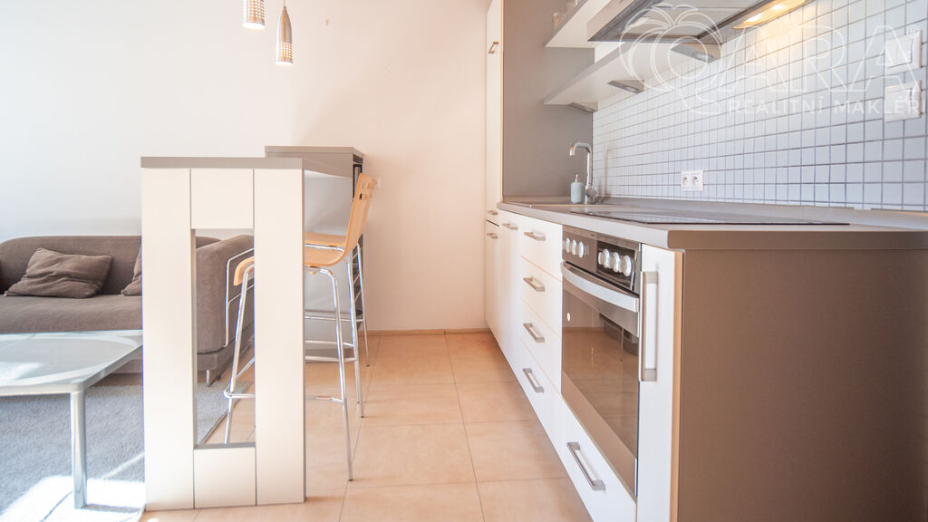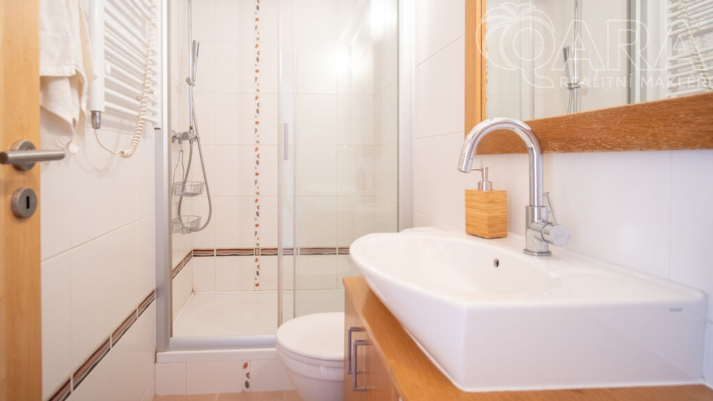 V obývacím pokoji je k dispozici rohová sedací souprava. Koupelna je vybavena sprchovým koutem, umyvadlem, WC a pračkou. Zvýšené podlaží nabízí šatnový úložný systém a postel. Detailně si můžete byt prohlédnout přes virtuální prohlídku v galerii.