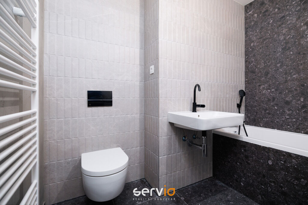 Koupelna s WC (4,9 m²) je vybavena zrcadlem a moderní sanitou.