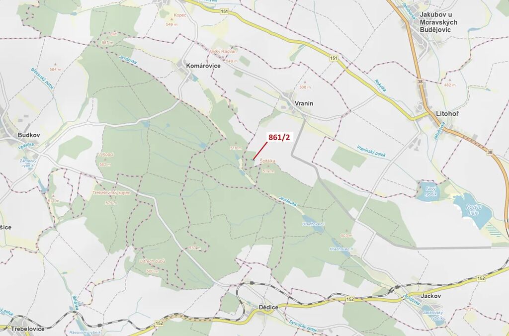 Lesní pozemek o výměře 834 m2, parcelní číslo 861/2, podíl 1/1, katastrální území Vranín, obec Moravské Budějovice, obec s rozšířenou působností Moravské Budějovice, okres Třebíč, Kraj Vysočina. Po těžbě.