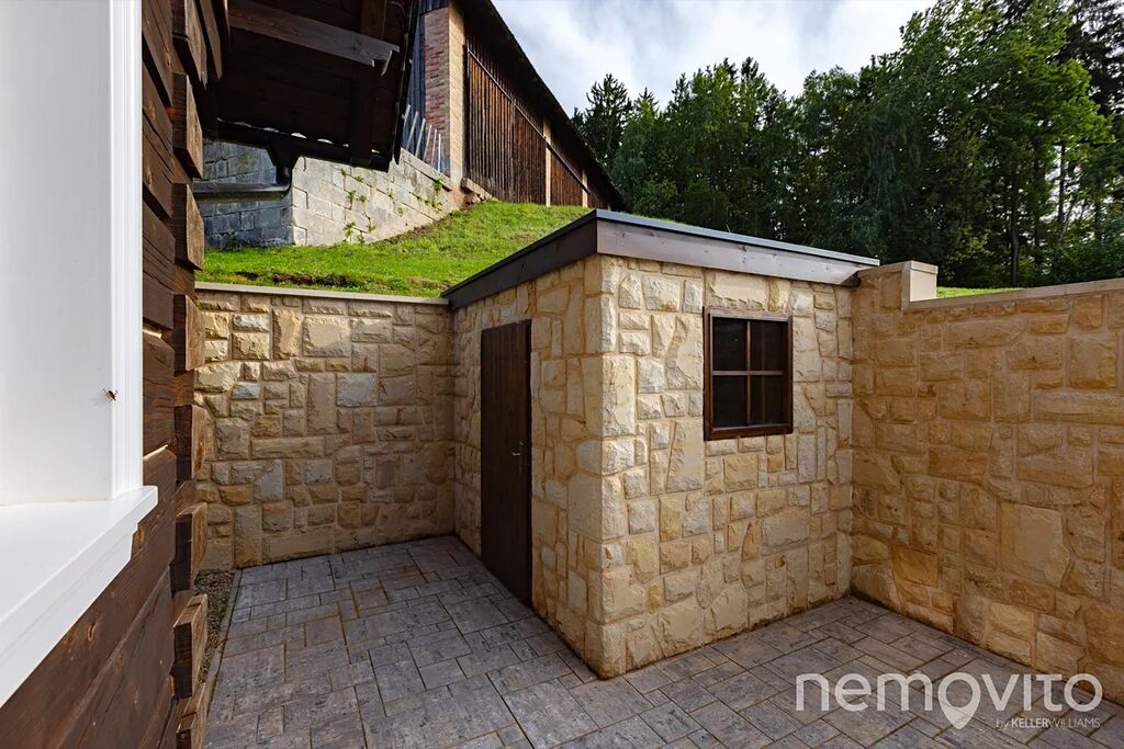 Dvoupodlažní dům s dispozicí 4+kk a dvěma koupelnami má nad celým půdorysem prostornou půdu a taky venkovní zahradní domek, který je stejně jako celá opěrná zeď obložen pískovcem. Všechny tři ložnice se nachází nahoře, dole je tak především společenská část domu s koupelnou, ve které je zakomponována sauna. Vytápění je dole řešeno podlahovkou, případně pak krásnými kachlovými kamny. V domě je dostatek světla díky soustavě velkých oken a kdo by snad zatoužil po zimní zahradě, zastřešený prostor nabízí velká terasa s přesahem střechy.