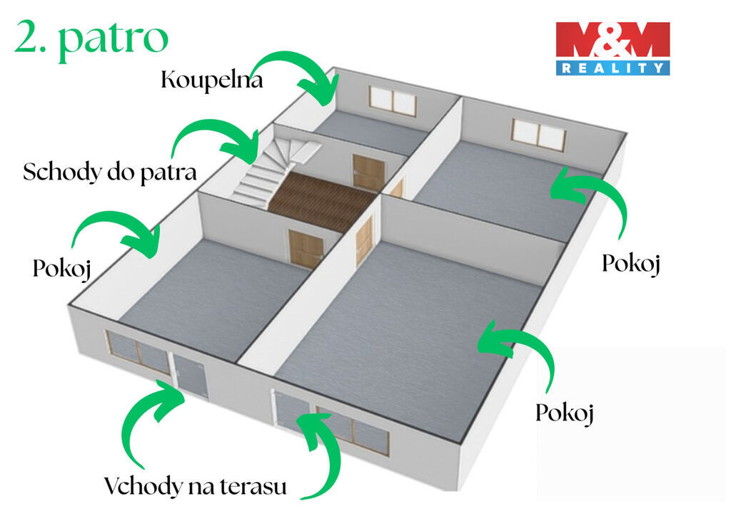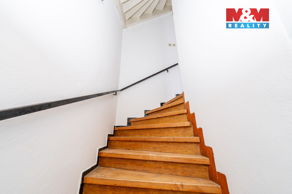 Tento řadový dům s užitnou plochou 138 m² se rozkládá na třech nadzemních podlažích a nabízí celkem 5 místností. V 1. patře -vstupní hala, garáž, kotelna, sklep, dílna, ve 2. patře - kuchyně a velký obývací pokoj s jídelnou, toaleta a ve 3. patře - tři pokoje a koupelna.