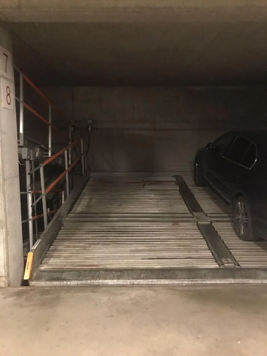 Garážové stání se nachází v podzemním patře cihlového domu. Jedná se o zakladač. Výměra činí 12m2. Výška 1.8m.