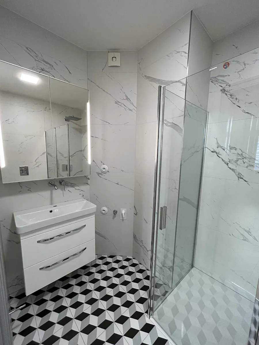 Byt je zařízený a nabízí plně vybavenou kuchyňskou linku, stylový mramorový konferenční stolek, pohovku, dvě pohodlná křesla, jídelní stůl se čtyřmi židlemi, prostorný pracovní stůl a postel.