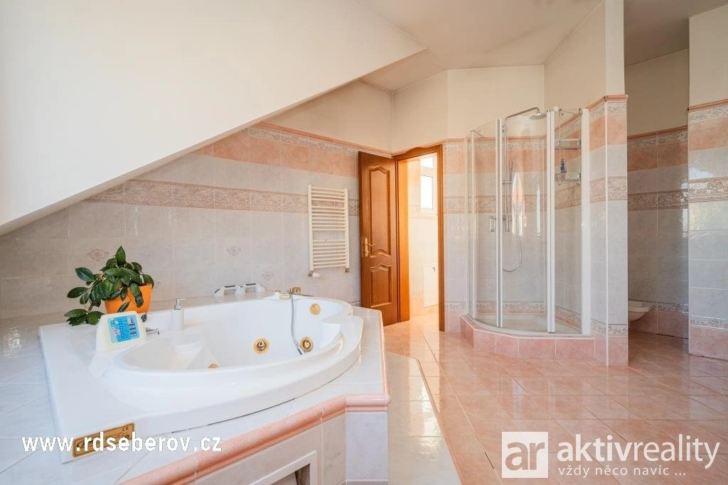 Suterén (343 m²): Využijte jej jako firemní wellness, privátní fitness, rehabilitační centrum nebo relaxační zónu. Zahrnuje velký bazén (10 x 4 m) s protiproudem, vířivku pro 6 osob, sprchový kout a technické zázemí (kotelna, vzduchotechnika).