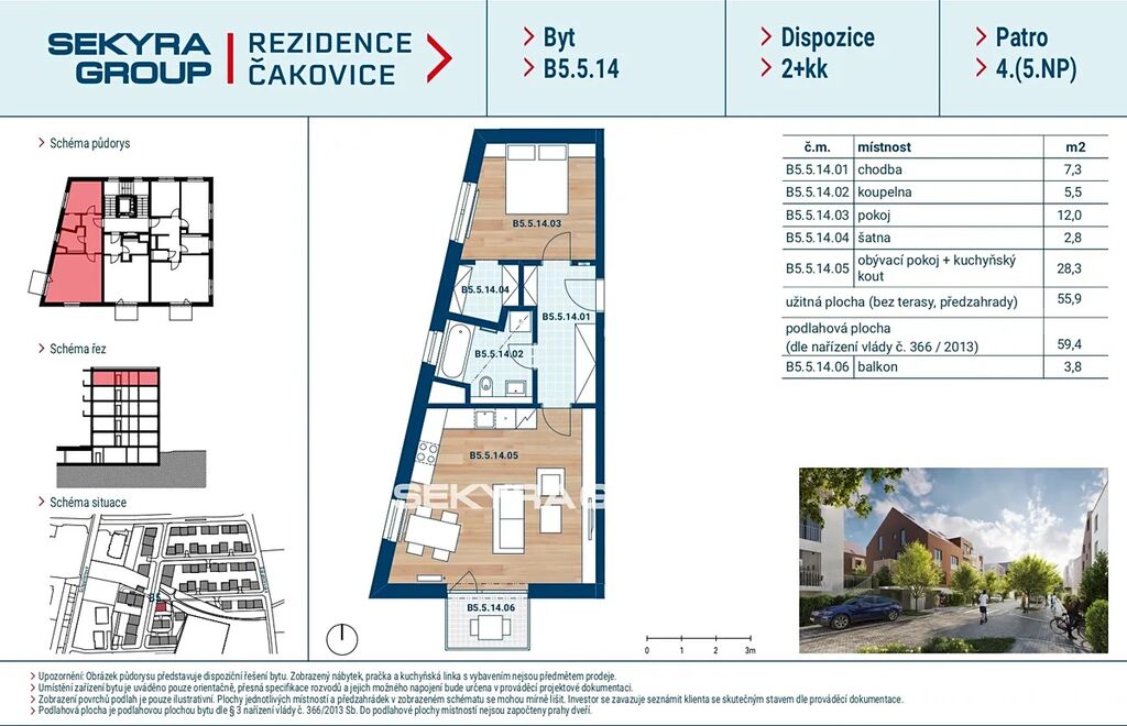 Dovolujeme si Vám nabídnout k prodeji byt 2+kk, 59,3 m² s balkónem 3,8 m² v rezidenčním projektu Rezidence Čakovice, etapa B