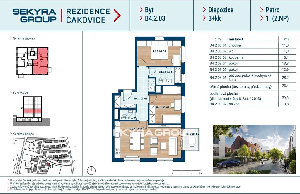 Dovolujeme si Vám nabídnout k prodeji byt 3+kk, 79,3 m² s balkónem 3,8 m² v rezidenčním projektu Rezidence Čakovice, etapa B