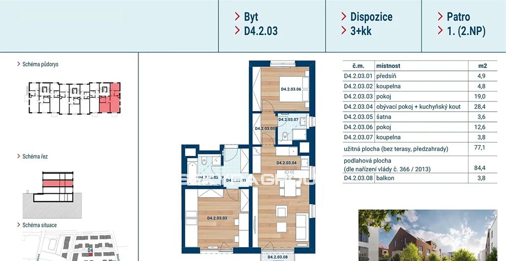 Dovolujeme si Vám nabídnout k prodeji byt 3+kk o výměře 84,4 m² s balkónem 3,8 m² v rezidenčním projektu Rezidence Čakovice.