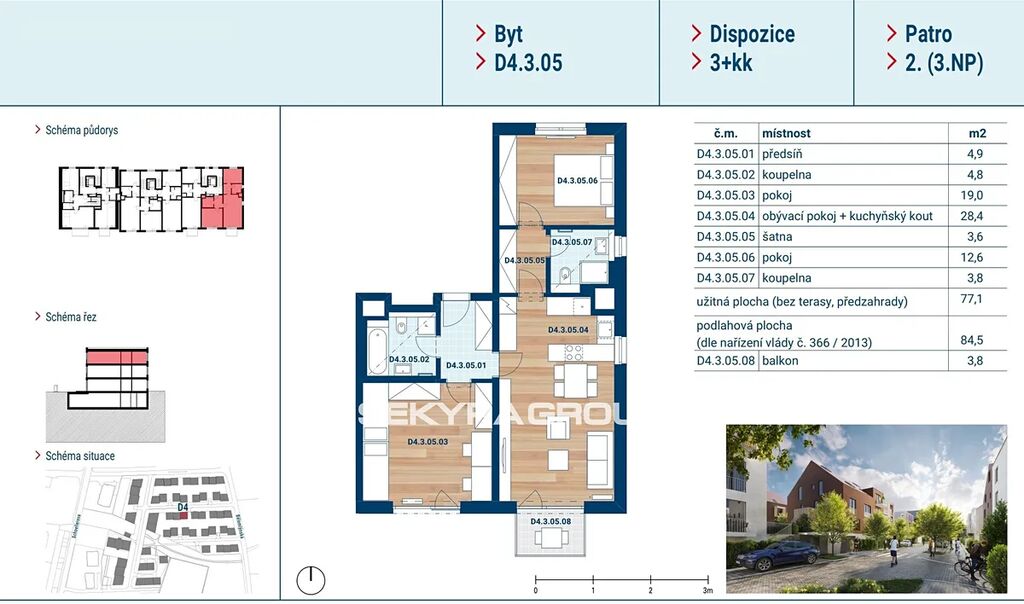 Dovolujeme si Vám nabídnout k prodeji byt 3+kk o výměře 84,5 m² s balkónem 3,8 m² v rezidenčním projektu Rezidence Čakovice.