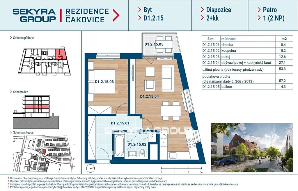 Dovolujeme si Vám nabídnout k prodeji byt 2+kk o výměře 57,2 m² s balkónem 4,3 m² v rezidenčním projektu Rezidence Čakovice.