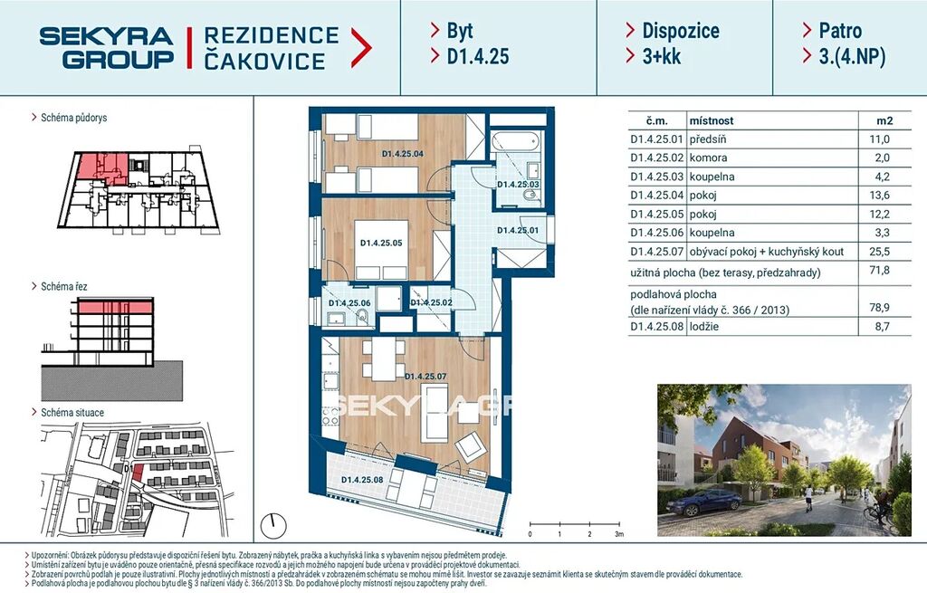 Dovolujeme si Vám nabídnout k prodeji byt 3+kk o výměře 78,9 m² s lodžií 8,7 m² v rezidenčním projektu Rezidence Čakovice.
