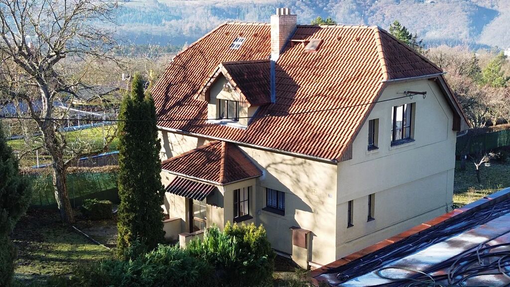 Vlastní pozemek 1.805 m2, zastavěná plocha domu 93 m2, oploceno, mírně svažitý pozemek se SZ orientací, udržovaná okrasná zahrada. Parkování vozidla bezproblémové v přilehlé ulici či na vlastním pozemku. Velice pěkný výhled do krajiny včetně údolí Vltavy.