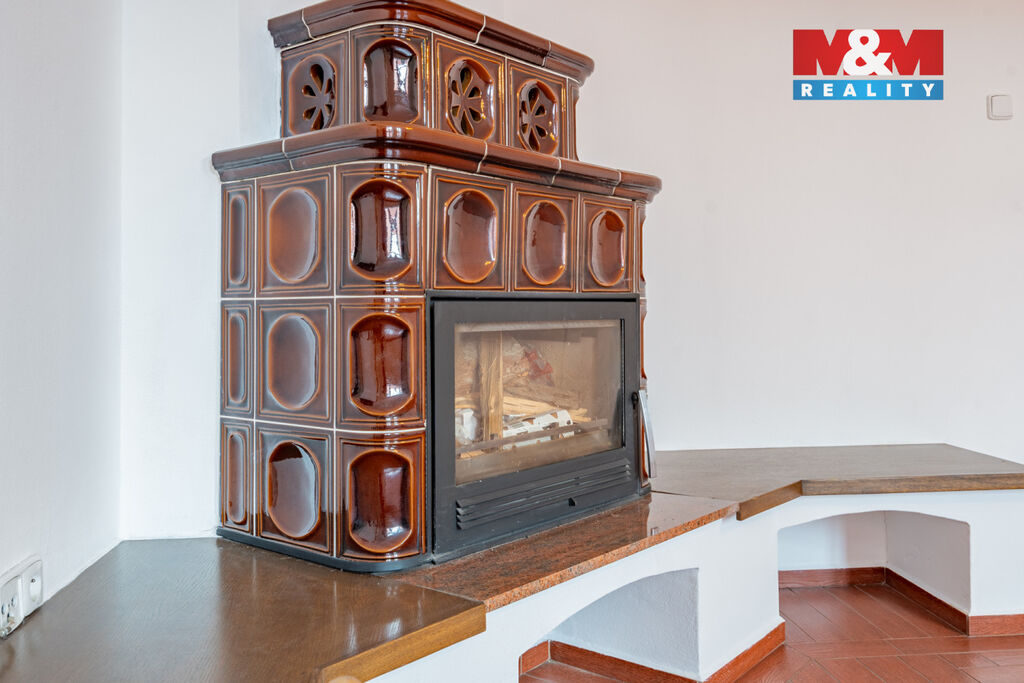 Vytápění zajišťuje plynový kotel, horní byt má navíc kachlová kamna s krbovou vložkou.