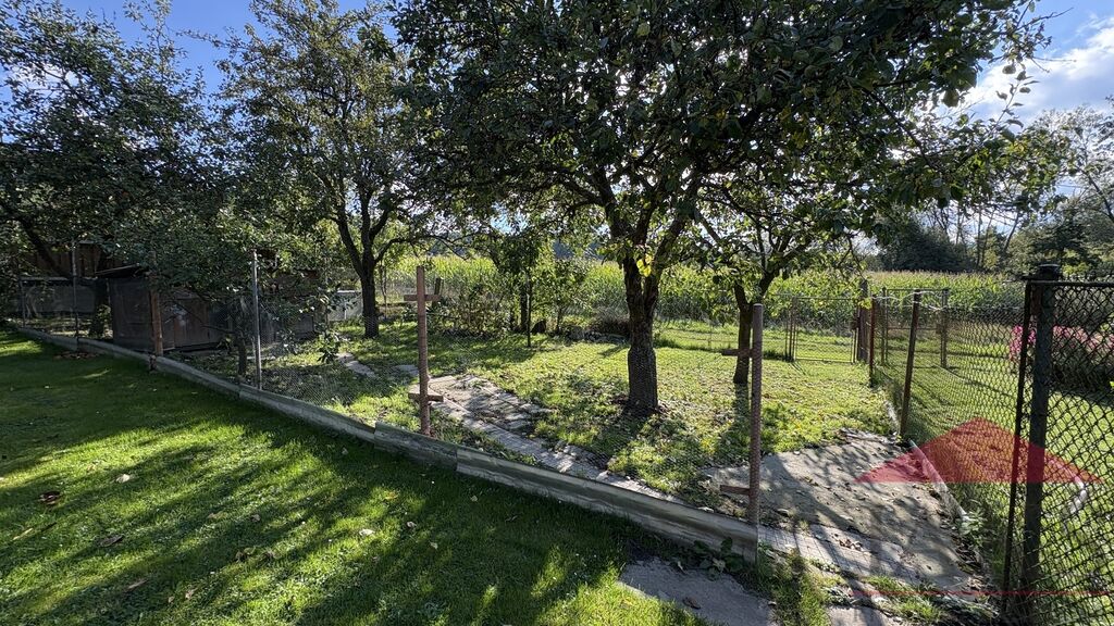 Zahrada: 587 m2 Schovaná za domem, oplocená, udržovaná, slunná, pěstěná zahrada s vyrovnaným místem na bazén či trampolínu, plodícími ovocnými stromy (jabloně, švestky, hruška a nektarinka) a keři (jahody, maliny, ostružiny, víno, rybíz...) a brankou s vjezdem na polní cestu.