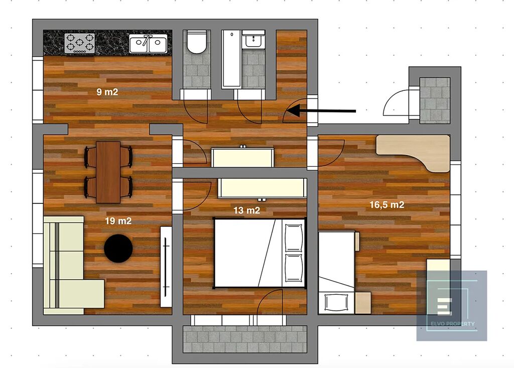 K prodeji si Vám dovoluji nabídnout bytovou jednotku v osobním vlastnictví o dispozici 3+kk s balkonem, velmi prostorným sklepem a komorou. Samotná podlahová plocha bytu je 72 m2, sklepa 17m2, balkónu 3,5m2 a komory 0,5m2. Celkem tedy jednotka zahrnuje 93m2 užitné plochy.