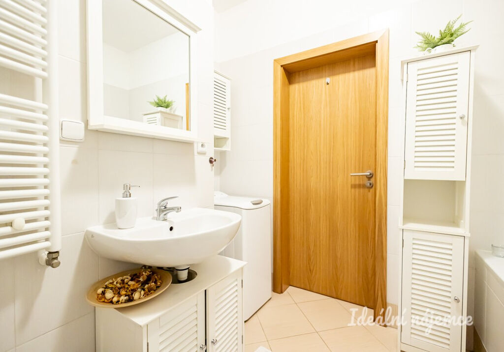 Byt je plně vybavený a připravený k okamžnému nastěhování. Kuchyňská linka je vybavena lednicí, elektrickou troubou, varnou deskou a digestoří. Nechybí jídelní stůl se židlemi. Obývací část disponuje šatní skříní, postelí (bez matrace), konferenčním stolkem a televizí. V koupelně najdete pohodlnou vanu, umyvadlo, toaletu a pračku. V chodbě je k dispozici další prostorná šatní skříň.