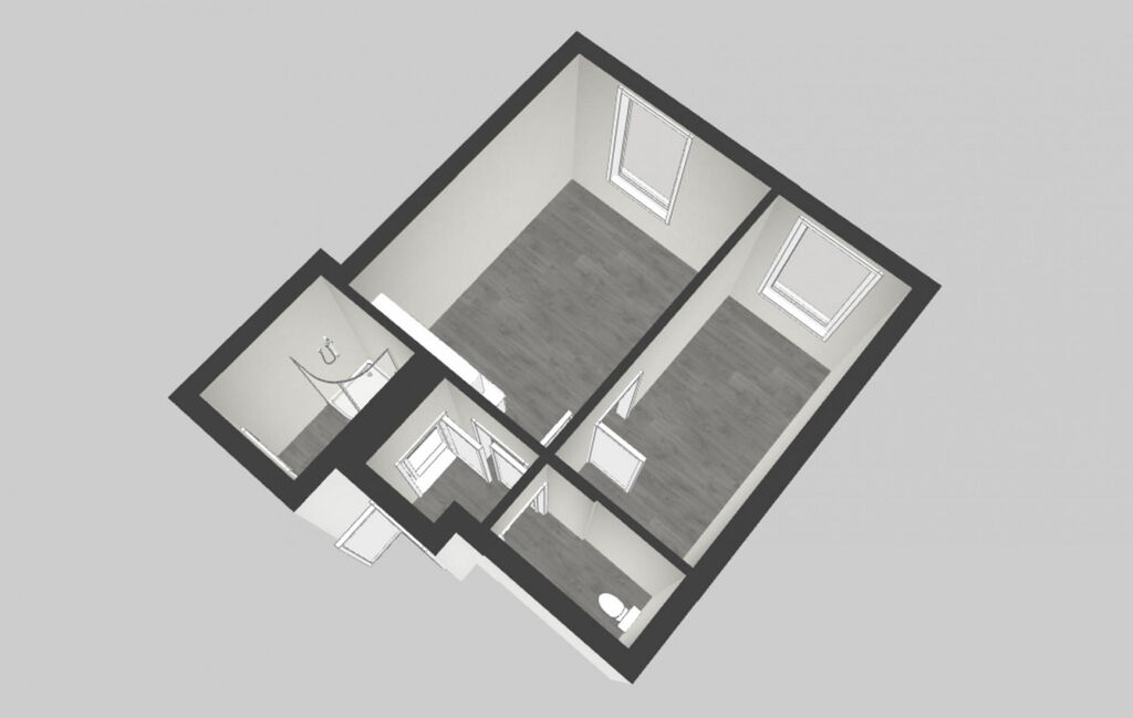 Byt tvoří vstupní chodba, obývací pokoj s kuchyňskou linkou, ložnice, koupelna a samostatné WC. I přes svou kompaktní velikost nabízí velmi praktické uspořádání vhodné pro jednotlivce nebo pár.