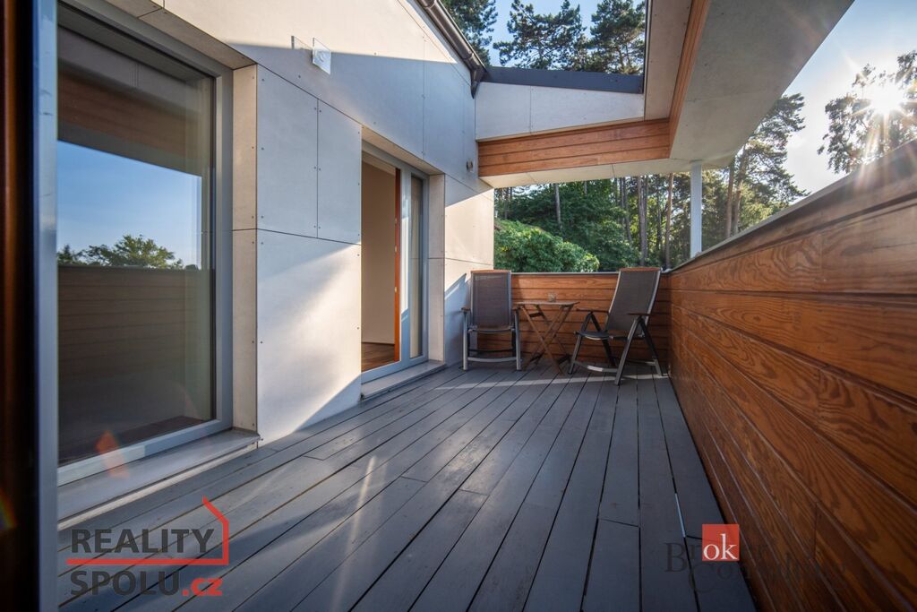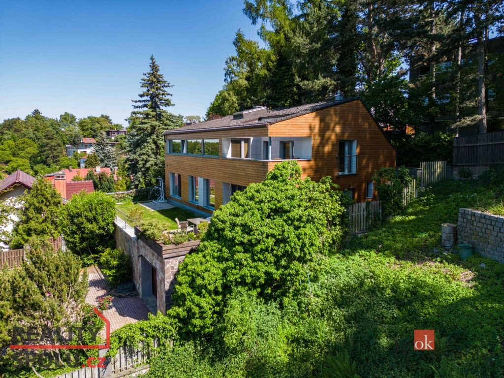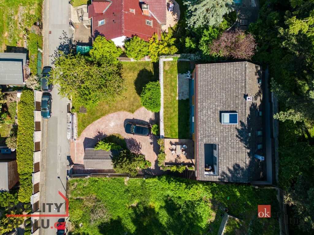 Dům má podlahovou plochu téměř 200m2 a k tomu 2 garáže. Stojí na svažitém, upraveném pozemku (723 m²) se vzrostlými stromy a na konci slepé ulice Za Mototechnou. Díky tomu, že dům stojí v horní části pozemku (nad garáží), máte úžasné výhledy jak z přízemí, kde je velká terasa a část zahrady, tak samozřejmě i v prvním patře domu.