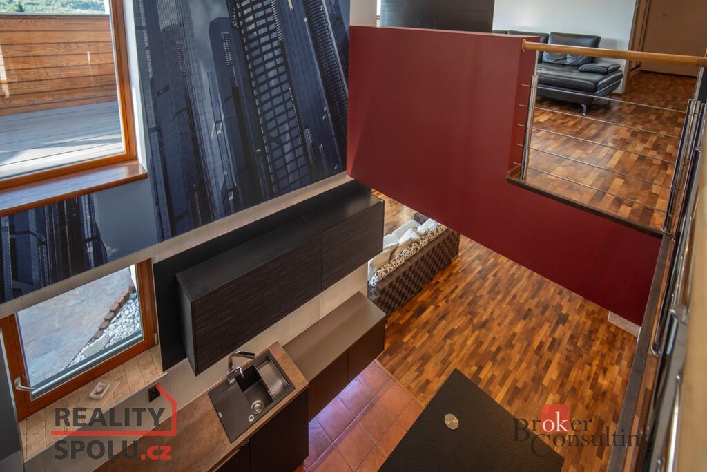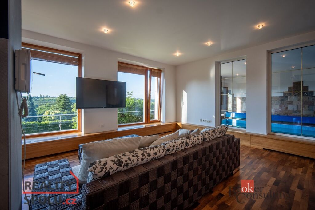 V přízemí domu se nachází velký obývací pokoj s kuchyní, koupelnou a vstupem do další části domu kde je vnitřní bazén a infrasauna. Tato část domu má 100 m2. Ve druhém patře je atrium, vstup do třech pokojů, na terasu a do koupelny. Hlavní ložnice má samostatný vstup do koupelny. Podlahy jsou dřevěné a v pokojích vestavěné skříně. Úžasné je prosklení, které je po celé délce severozápadní stěny s výhledem na část Prahy 5 a dále – Motol, Ladronku až po Břevnov.
