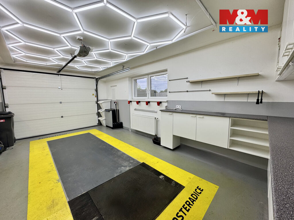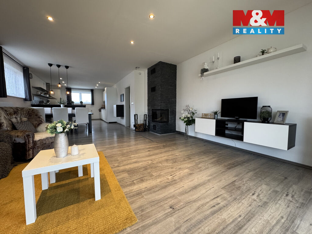 Srdcem domu je velkorysý obývací pokoj s kuchyňským koutem, krbem, klimatizací a přímým vstupem na terasu. Dispozice domu dále zahrnuje tři samostatné pokoje, koupelnu, WC, technickou místnost a garáž.