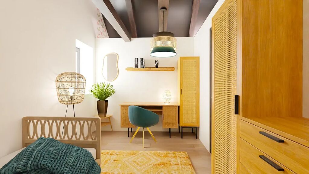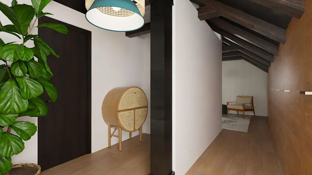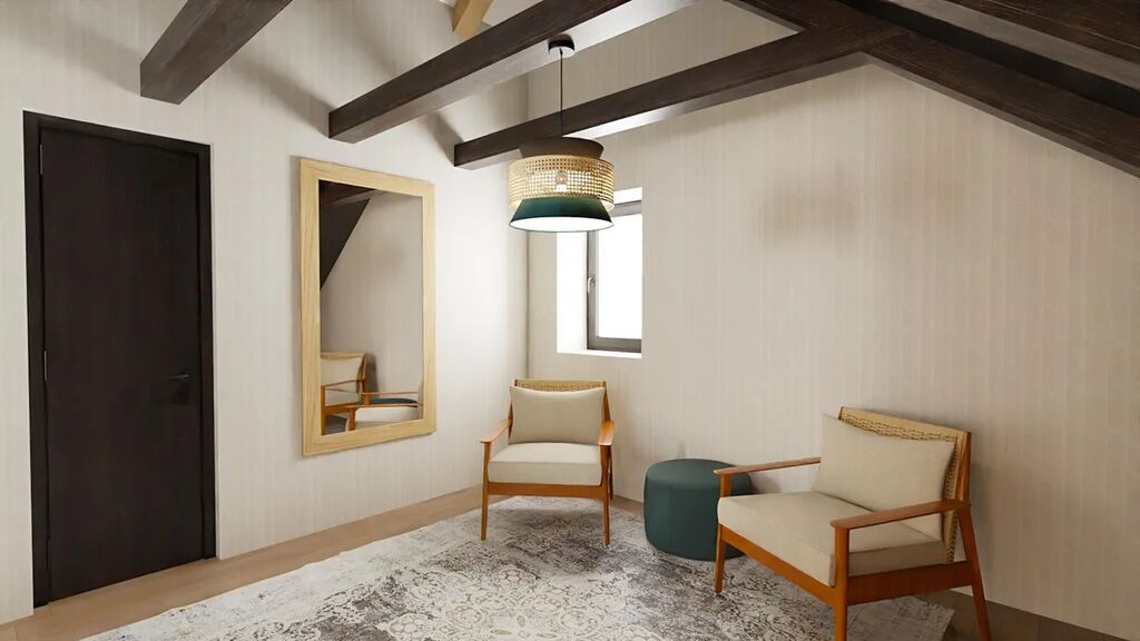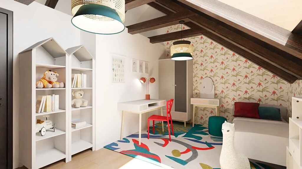 Dům má užitnou plochu 180 m2 a prozatím dispozici 4+kk - ve spodním patře je kuchyně propojená s obývacím pokojem, koupelna a dvě ložnice. V patře je pak aktuálně na místnosti nedělené podkroví. V galerii se můžete podívat na dvě možné varianty řešení. První návrh představuje podkroví jako jeden velký obytný prostor s ložnicí a obývací částí, kdy chodba slouží zároveň jako šatna a prostor před koupelnou jako pracovní koutek. Druhý návrh přidává další 2 místnosti coby dětské pokoje či ložnice s místem pro úložné prostory.