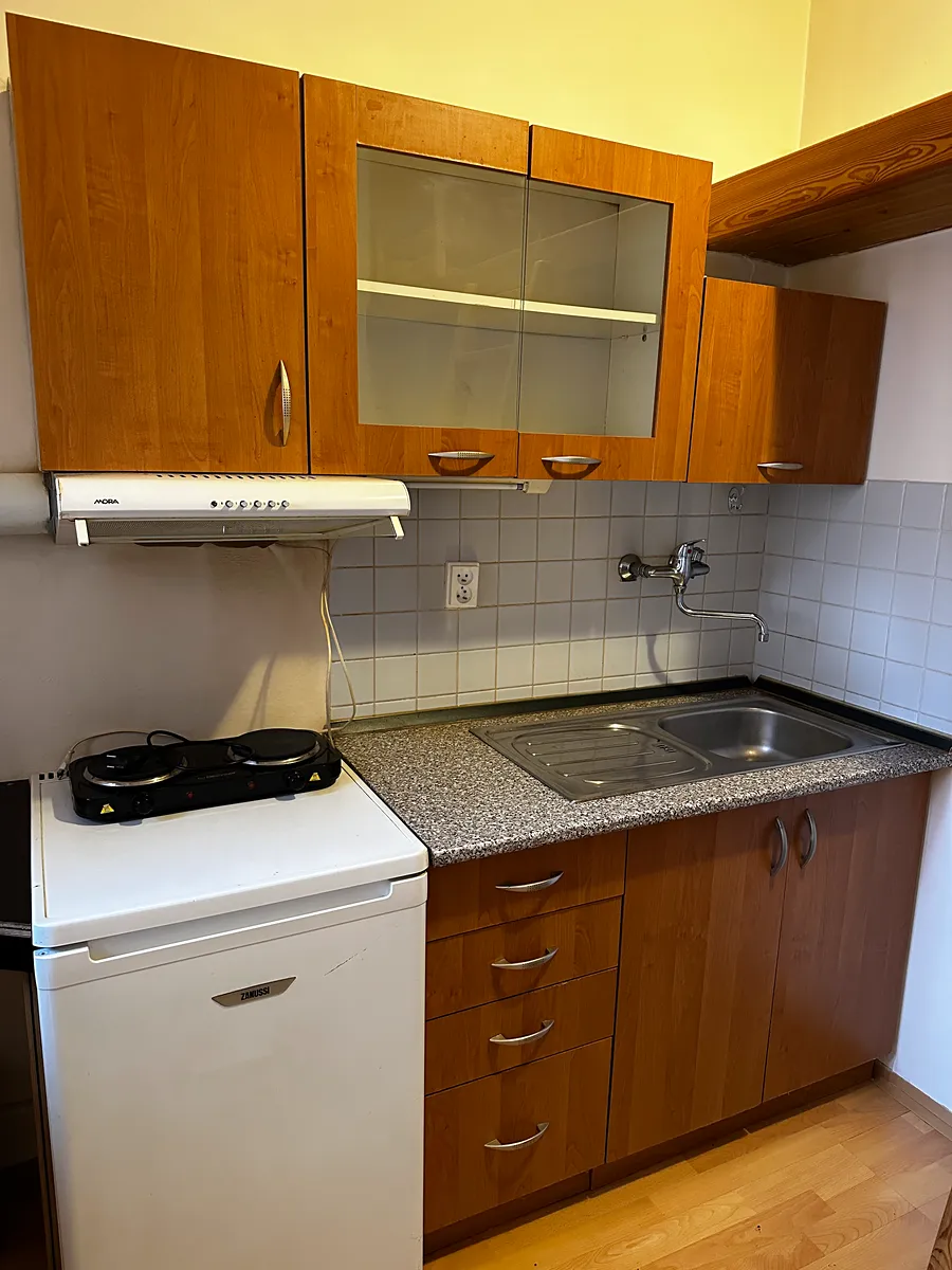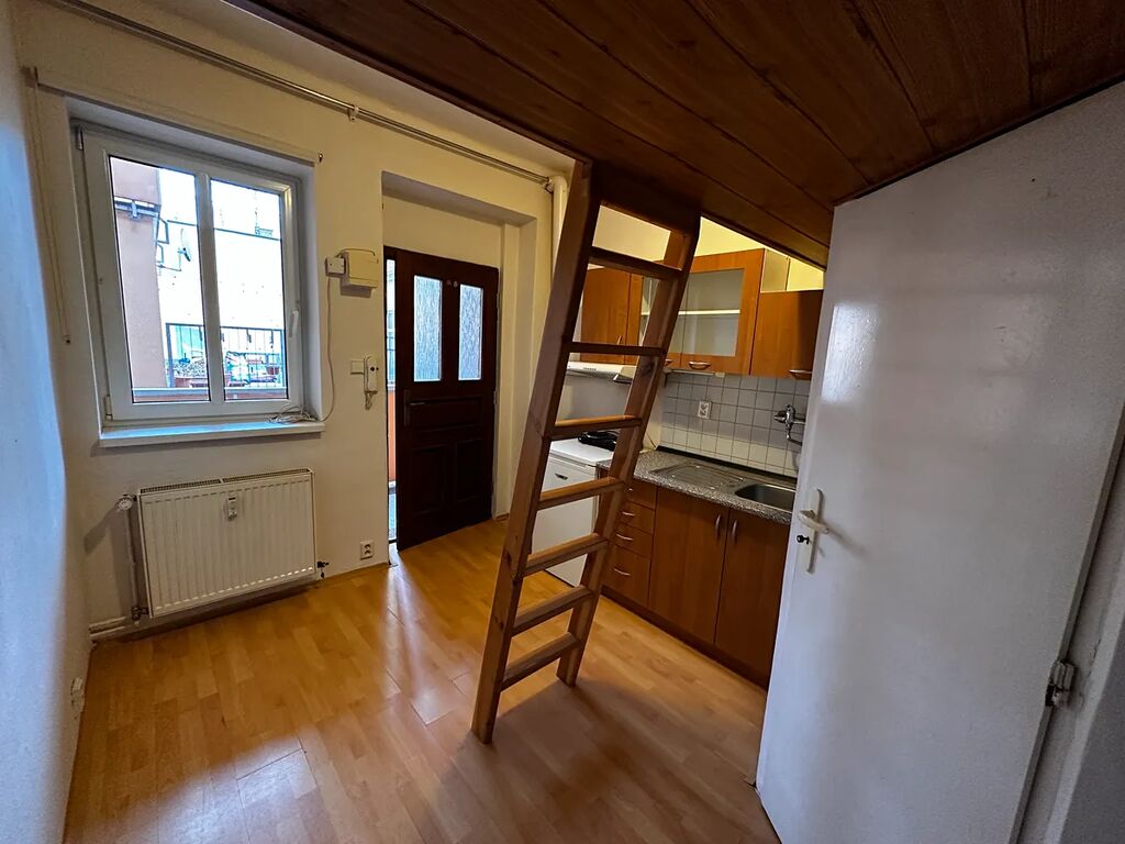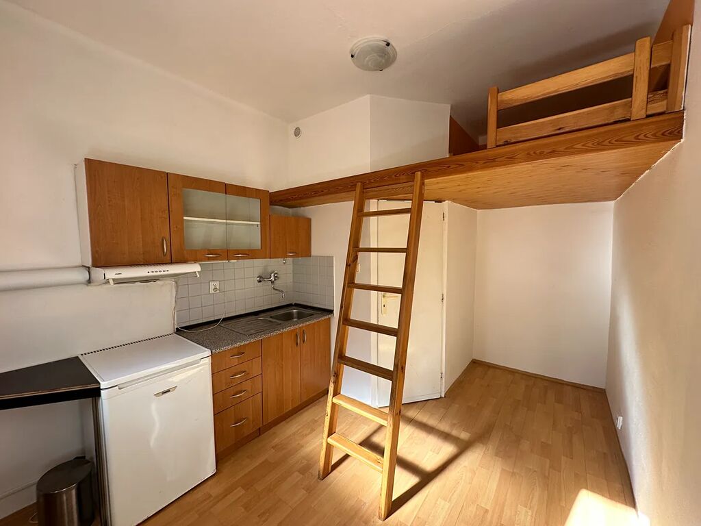 Nabídka pronájmu světlého bytu 1+kk (13 m2) ve 1. NP cihlového domu s výtahem na Bělohorské ulici v městské části Praha 6, Břevnov. Byt je pronajímán částečně vybavený, včetně kuchyňské linky a dřevěného mezipatra. V bezprostřední blízkosti se nachází tramvajová zastávka Drinopol, odkud se dostanete rychle a pohodlně do centra města.