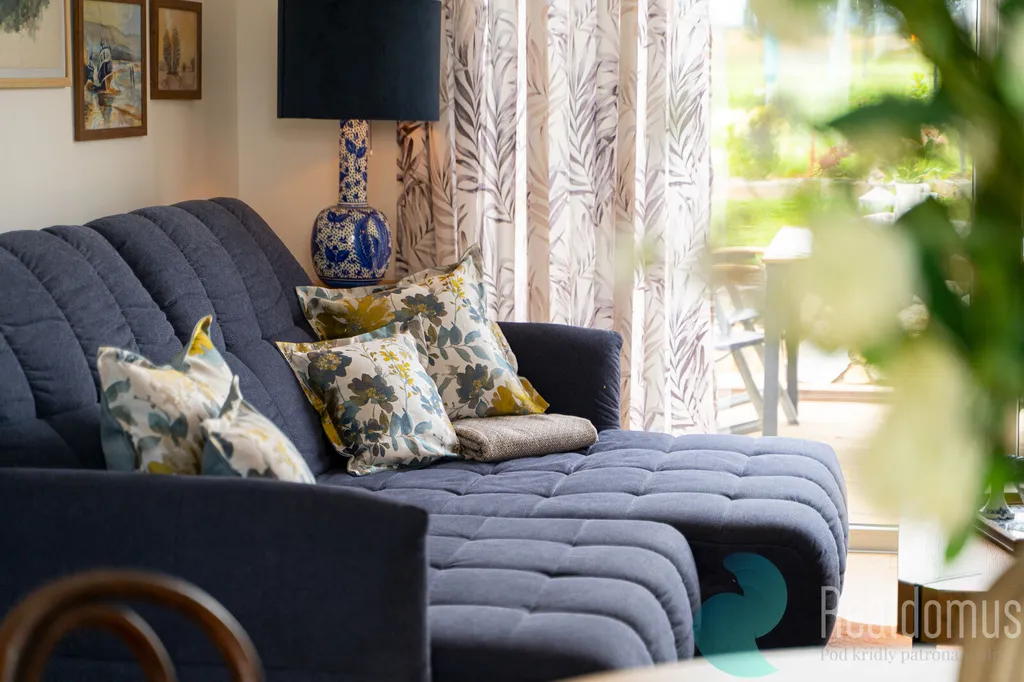 Interiér působí velmi vzdušně a svěže, nechybí moderní kuchyně ani stylová krbová kamna Romotop, která vytvářejí útulnou atmosféru. Kromě kamen zajišťuje vytápění také tepelné čerpadlo a v místnostech s dlažbou je podlahové topení. Díky izolačním trojsklům a kvalitnímu zateplení si dům drží nízkoenergetický standard a příjemné klima po celý rok.