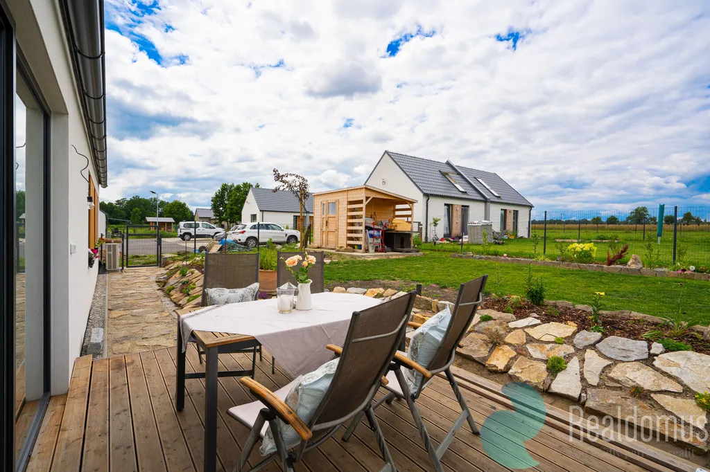 Samostatný bungalov je spojen se sousedním domem pergolou, které tvoří kryté stání – každý dům má k dispozici prostor pro dvě auta. Pozemek má rozlohu 491 m², užitná plocha domu činí 80 m² a je skvěle využita. Výborně řešená dispozice zahrnuje zádveří, technickou místnost, samostatné WC, koupelnu, dva pokoje, ložnici, kuchyňský kout se spíží a světlý obývací pokoj propojený s jídelnou a vstupem na terasu.