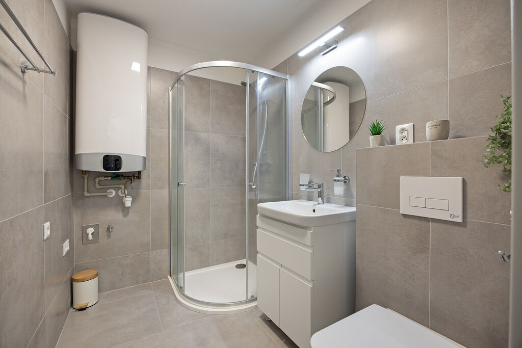 Byt je vybaven podlahovým vytápěním s možností regulace teploty v každé místnosti, ohřev vody zajišťuje elektrický bojler.