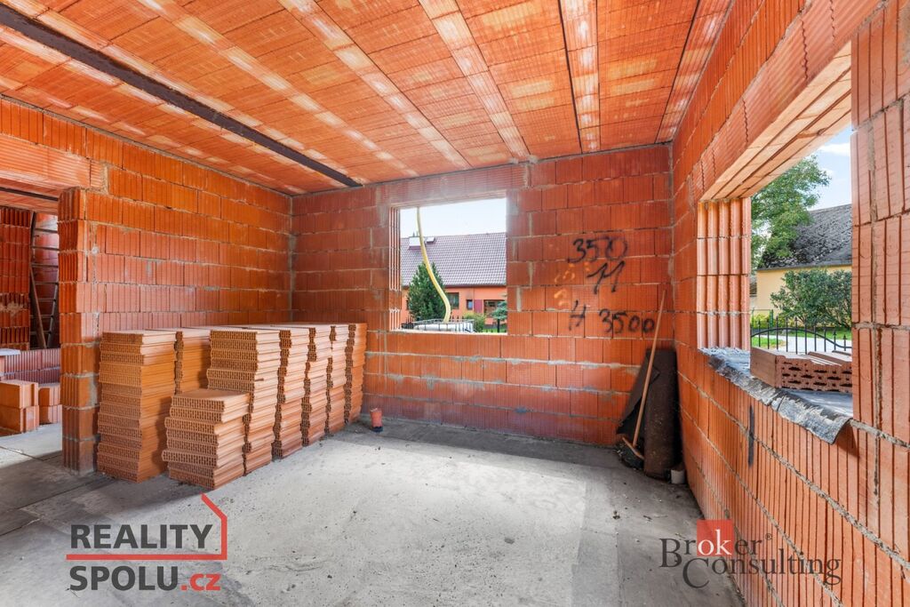 Dvoupodlažní cihlový dům o celkové ploše přibližně 204 m² stojí na pozemku o velikosti 546 m² a je ve fázi hrubé stavby – má vyzděné obvodové i vnitřní zdi a dokončenou střechu. Na pozemku jsou kompletní inženýrské sítě – vodovod, kanalizace, elektřina i plyn – a k dispozici je kompletní projektová dokumentace, která umožňuje dokončit dům podle původního návrhu nebo upravit detaily dle vlastních představ.