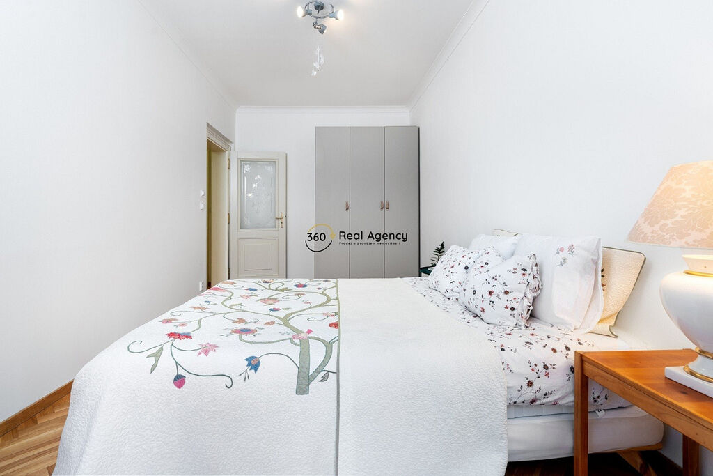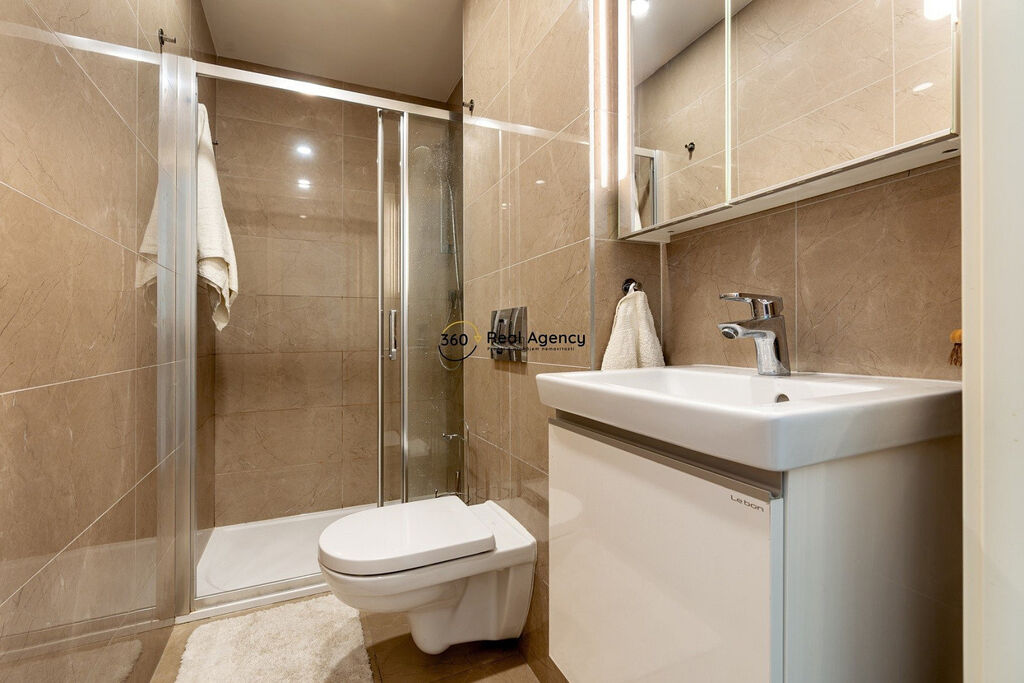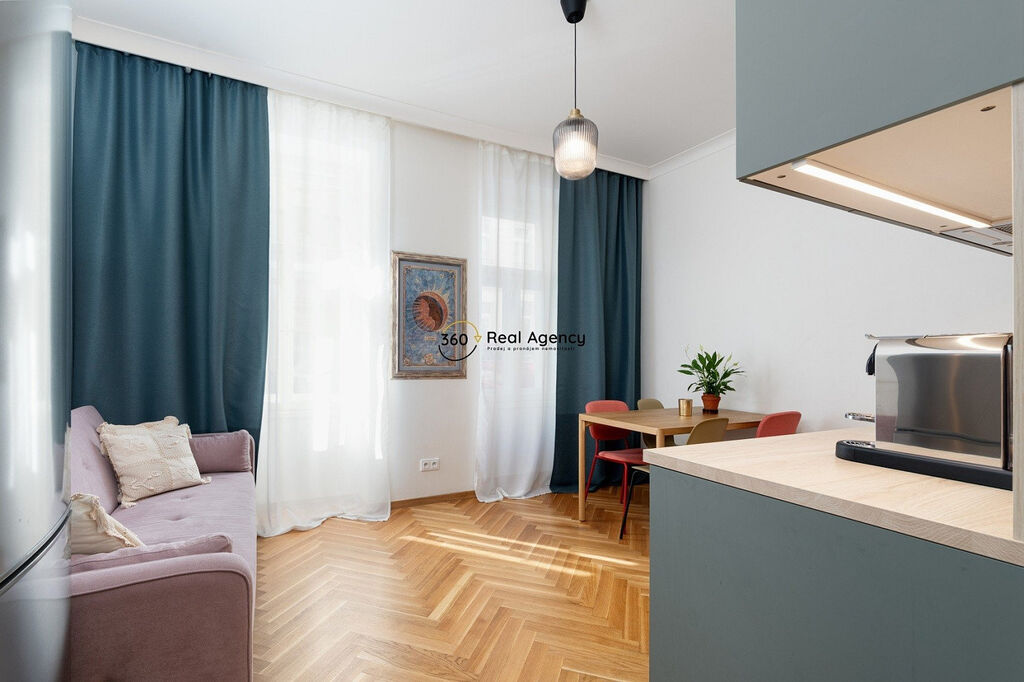 Interiér je proveden ve vysokém standardu – dřevěné parkety, kvalitní kuchyňská linka na míru a nadčasové vybavení koupelny. Díky velkým oknům je byt světlý a působí velmi vzdušným dojmem.