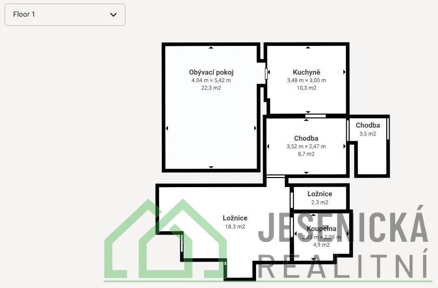 1. podlaží: kuchyně, obývací pokoj, chodba, koupelna, špajz, technická místnost a schodiště do patra