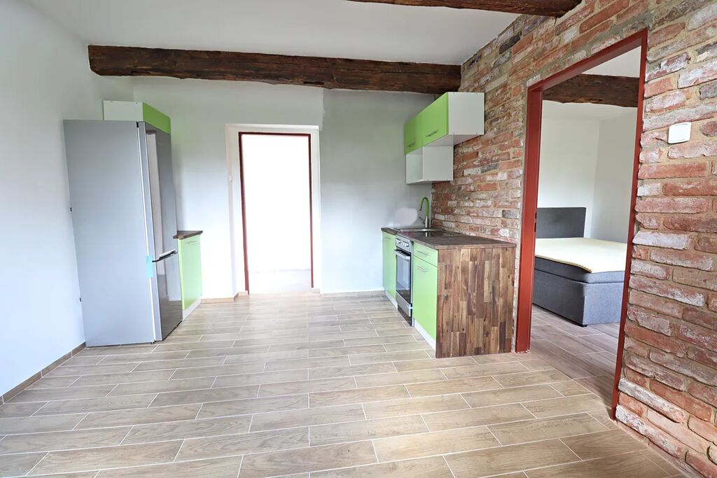 Nabízíme k pronájmu bytovou jednotku 2+kk, která se nachází v přízemí zrekonstruovaného domu. Byt je tvořen zádveřím s chodbou, ze které je vstup do koupelny s WC a do obývacího pokoje s kuchyňským koutem. Z obývacího pokoje je vstup do ložnice. K bytu náleží možnost využívat malý sklad na dvoře areálu. Byt je vybavený kuchyňskou linkou s el.kamny, pračkou a lednicí. Měsíční nájem činí 10.000,-Kč plus energie a služby cca 3.000,-Kč dle počtu osob. Kauce 20.000,-Kč plus odměna RK ve výši jednoho nájmu. Máme zájem o slušné pracující nájemníky bez domácích mazlíčků.