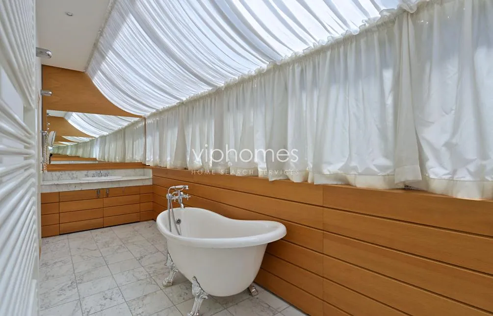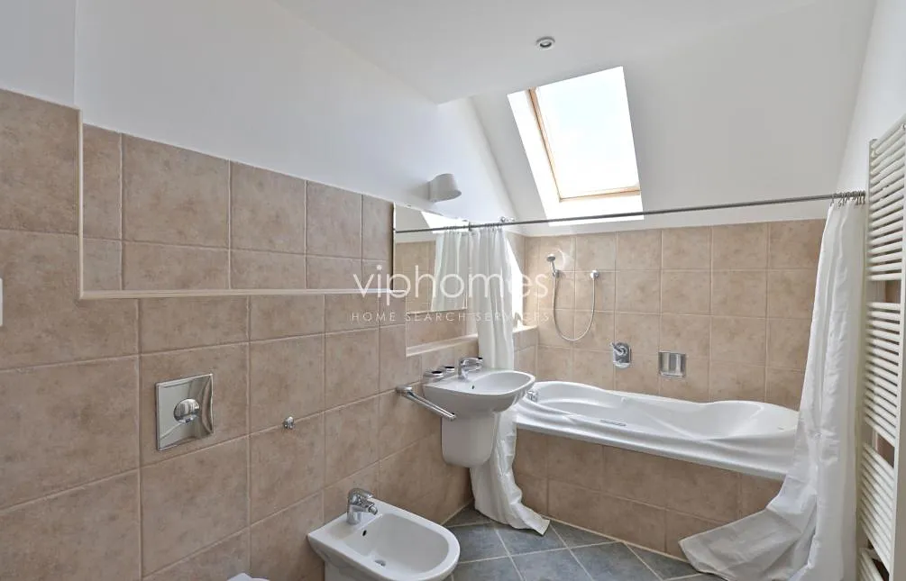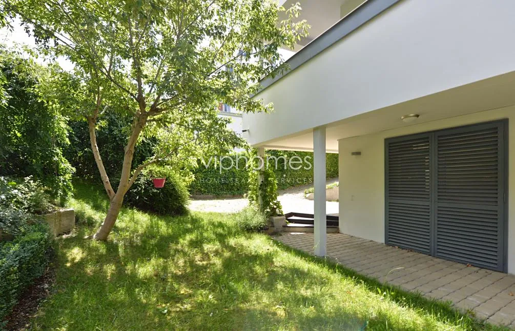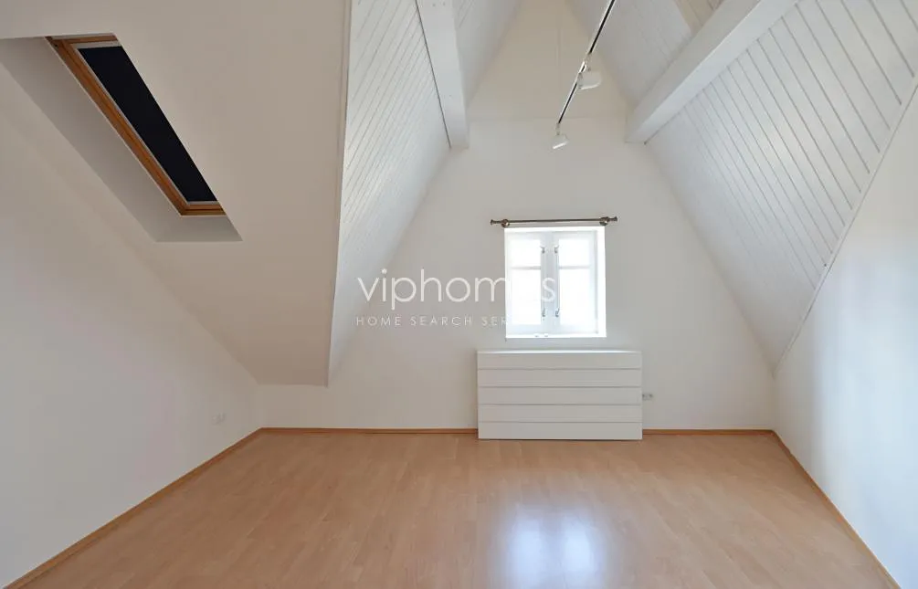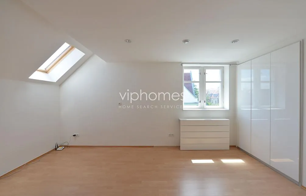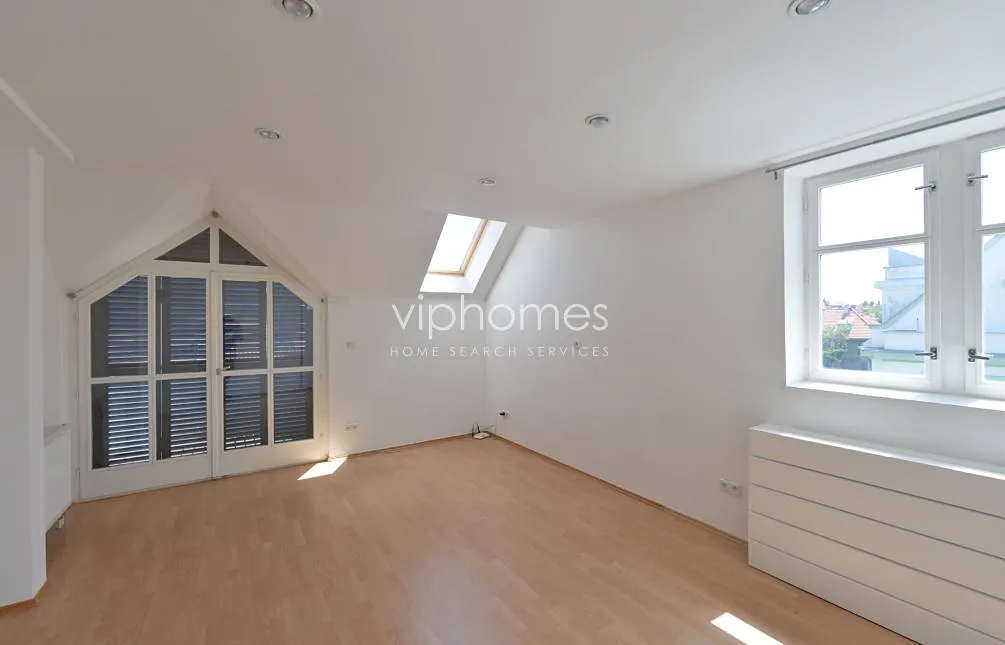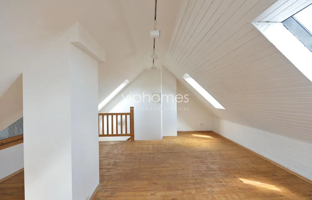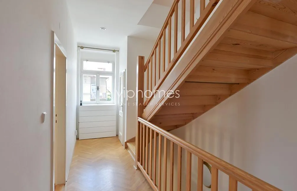 První patro:: 1. ložnici s vestavěnou skříní a přímým vstupem na balkón s výhledem do zahrady, 2. ložnice s vlastní šatnou a přímým vstupem na terasu s výhledem do ulice, 2 koupelny (vana, sprchový kout, toaleta a bidet) a oddělená toaleta.